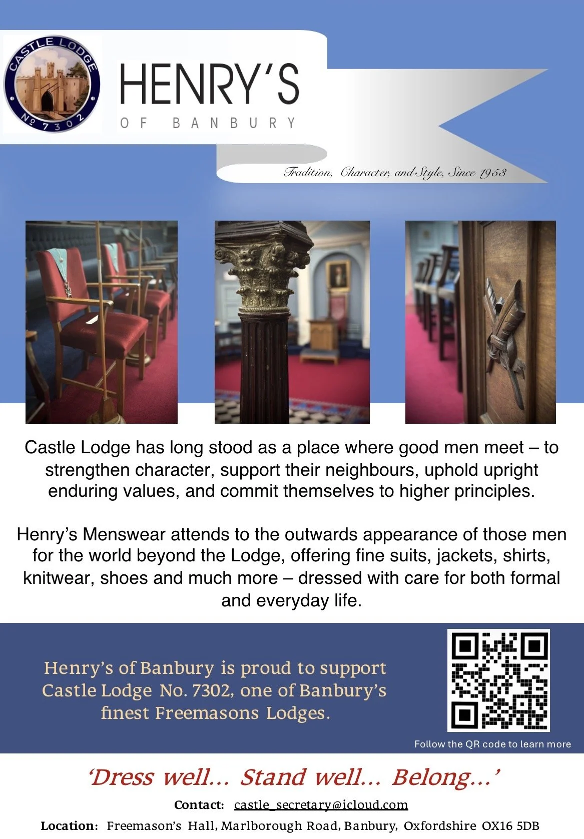 Castle Lodge is proud to have partnered with Henry's of Banbury. Located on Banbury High Street - Henry's caters to the needs of the well-dressed man-about-town, providing off-the-peg or made to measure suits, jackets, knitwear, shirts and shoes for both formal and casual wear, along with a large range of accesories. Whether you're refining your outward style or building inner purpose, our partnership offers places where men can dress well, stand well, and belong...